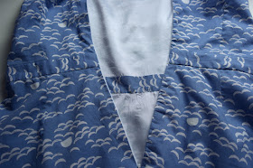 Al planchar he metido hacia dentro el margen de costura de 1,5 cm de los dos huecos que hemos dejado para las mangas.. Así será más fácil....
